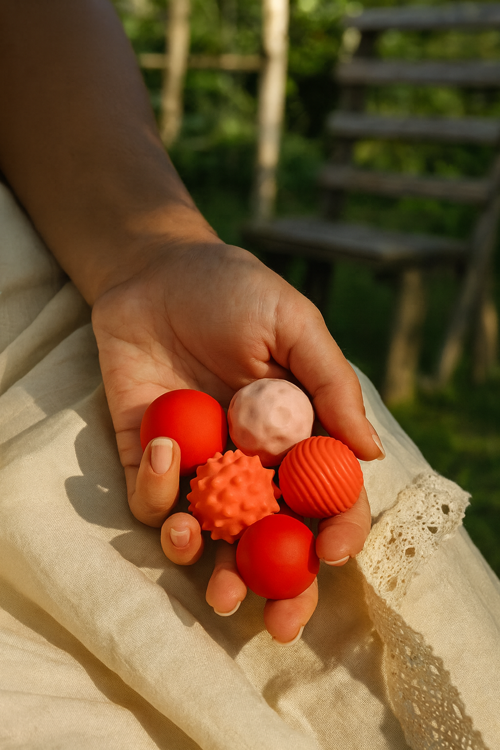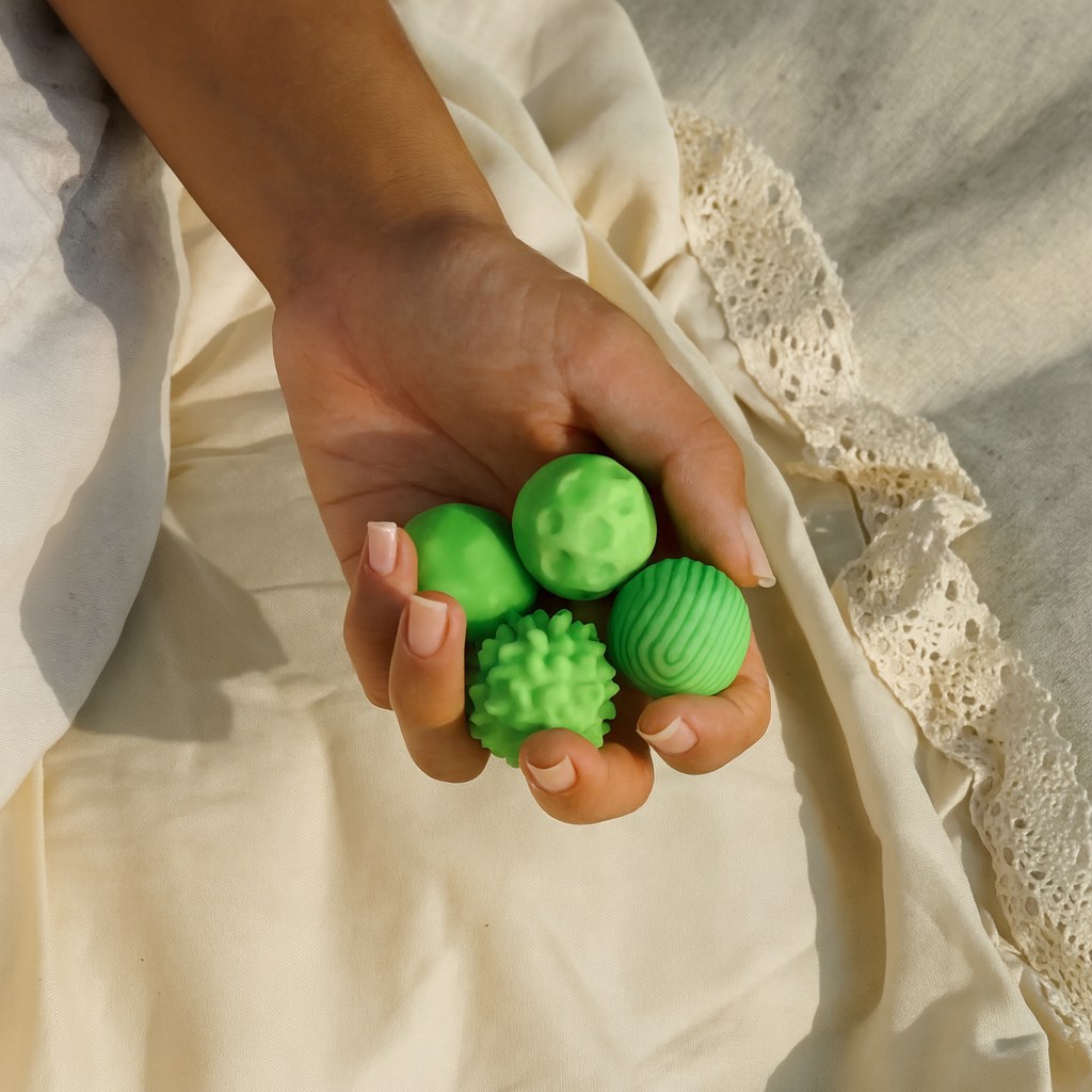 Jede Kugel hat eine andere Struktur – gewölbt, genoppt, geriffelt oder vertieft. Diese Vielfalt aktiviert die Tastrezeptoren und hilft dem Körper, sich zu entspannen.